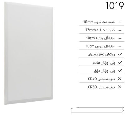 ✓ ضخامت درب 18mm ✓ حداقل ارتفاع 10cm ✓ حداقل عرض 19cm ✓ روكش PVC ممبران ✓ پلى اورتان مات