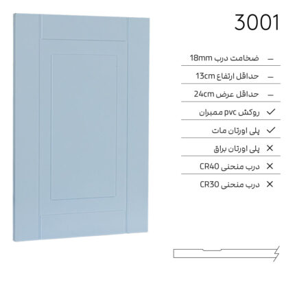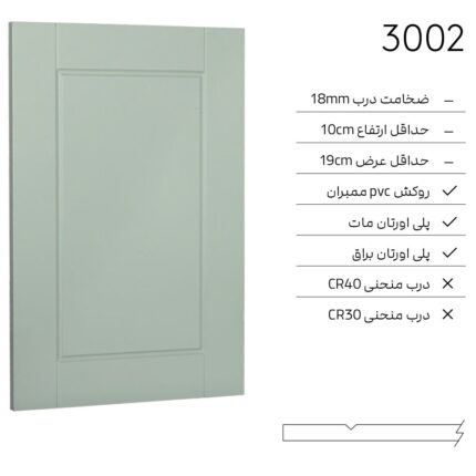 ✓ ضخامت درب 18mm ✓ حداقل ارتفاع 13cm ✓ حداقل عرض 24cm ✓ روكش PVC ممبران ✓ پلى اورتان مات
